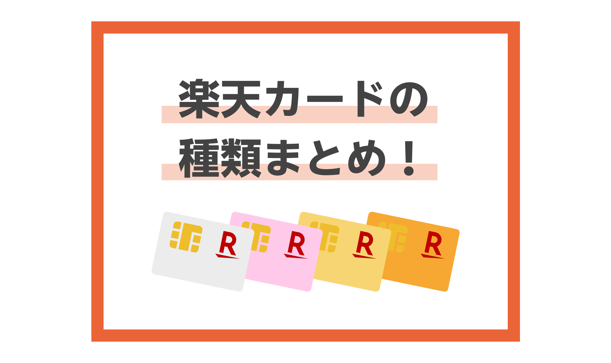 2023年12月時点で、楽天カード・楽天PINKカード・楽天ゴールドカード・楽天プレミアムカード・楽天銀行カード・楽天ANAマイレージクラブカード・楽天カード アカデミー・アルペングループ 楽天カードの8種類があります。