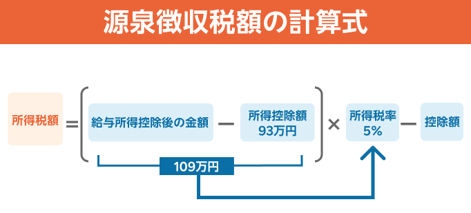 例えば、支払金額300万円(給与所得控除後の金額202万円)、所得控除の合計額93万円の場合、源泉徴収税額は5万4,500円です。