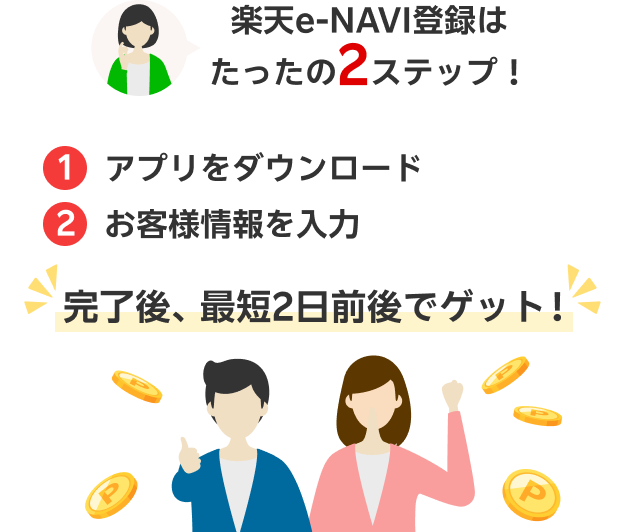 - 【特典1】 新規入会特典…カード到着後、楽天カード会員様専用のオンラインサービス「楽天e-NAVI」に初回登録が完了した2日前後