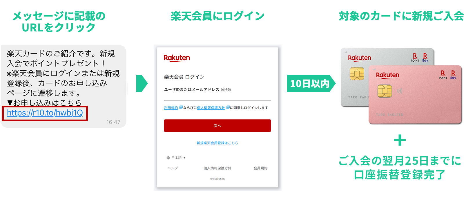 紹介キャンペーン特典の進呈は紹介された方がQRコードを読み取るか受信したURLをクリックし、楽天会員にログインしてから10日以内に対象カードをお申し込みされ、口座振替登録の完了が条件となります。